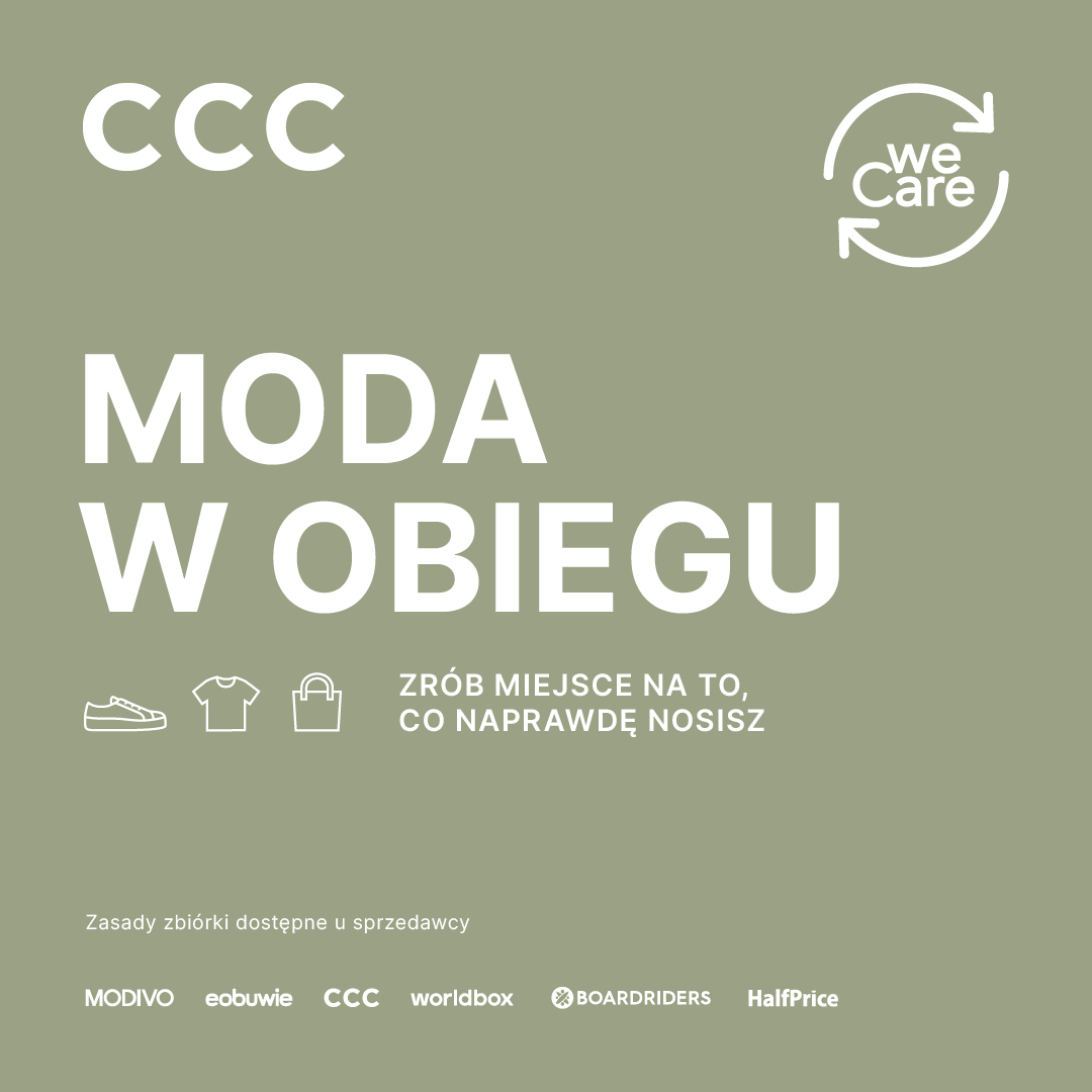 Zrób miejsce na to, co naprawdę nosisz. We wszystkich sklepach stacjonarnych CCC, HalfPrice, eobuwie, Boardriders w Polsce rozszerzamy prowadzoną przez nas od 2020 roku zbiórkę używanego obuwia o kolejne kategorie produktów – ubrania i akcesoria! Dajemy modzie drugie życie, a Ty zyskujesz miejsce w szafie na ulubione modowe perełki. Ty też możesz się włączyć! Przynieś czyste, suche buty, a także odzież i dodatki dowolnej marki i włóż je do specjalnego pojemnika znajdującego się przy kasach. Zachęcamy Klientów do przynoszenia rzeczy, których już nie noszą.